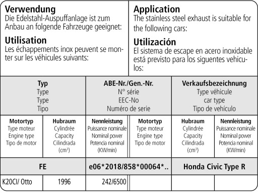 *) Ref-Fzg.: Honda Civic Type R 242/6500 U/min, Eingangsmessung: 235,6 KW / 426,2 NM; Messung mit Sportauspuffanlage: 239,2 KW / 431,9 NM;