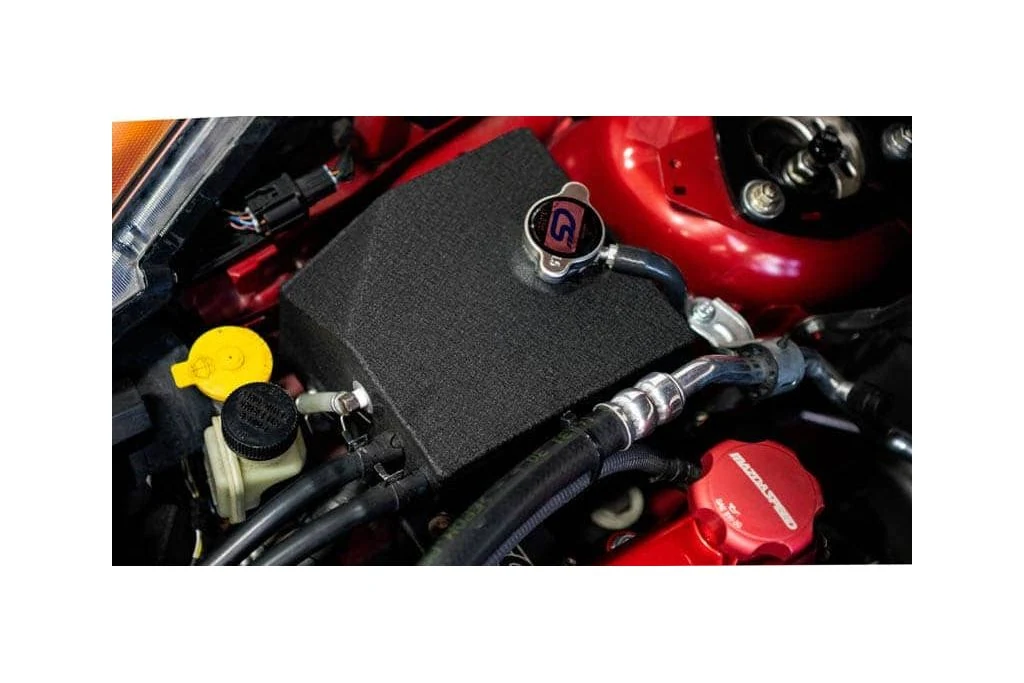 The CS coolant res replaces your ugly, yellow OEM coolant tank with a sleek design that looks much better under the hood of your Mazda. The wrinkle black powdercoat looks at home in any engine bay, whether you are mostly stock or have custom powdercoated components all over. We even hid the mounting locations for an extra clean look.