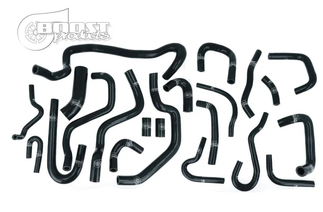 Die Silikonschlauchkits von BOOST products ersetzen die jeweiligen Serienschläuche, welche sich meist nach kürzester Zeit, insbesondere bei fortgeschrittenen Fahrzeugalter, im Unterdruckbereich zusammenziehen und im Überdruckbereich zu stark ausdehnen. Darunter leidet die Performance des Fahrzeugs. Auch im Bereich Kühlwasser werden originale Schläuche hart und undicht.