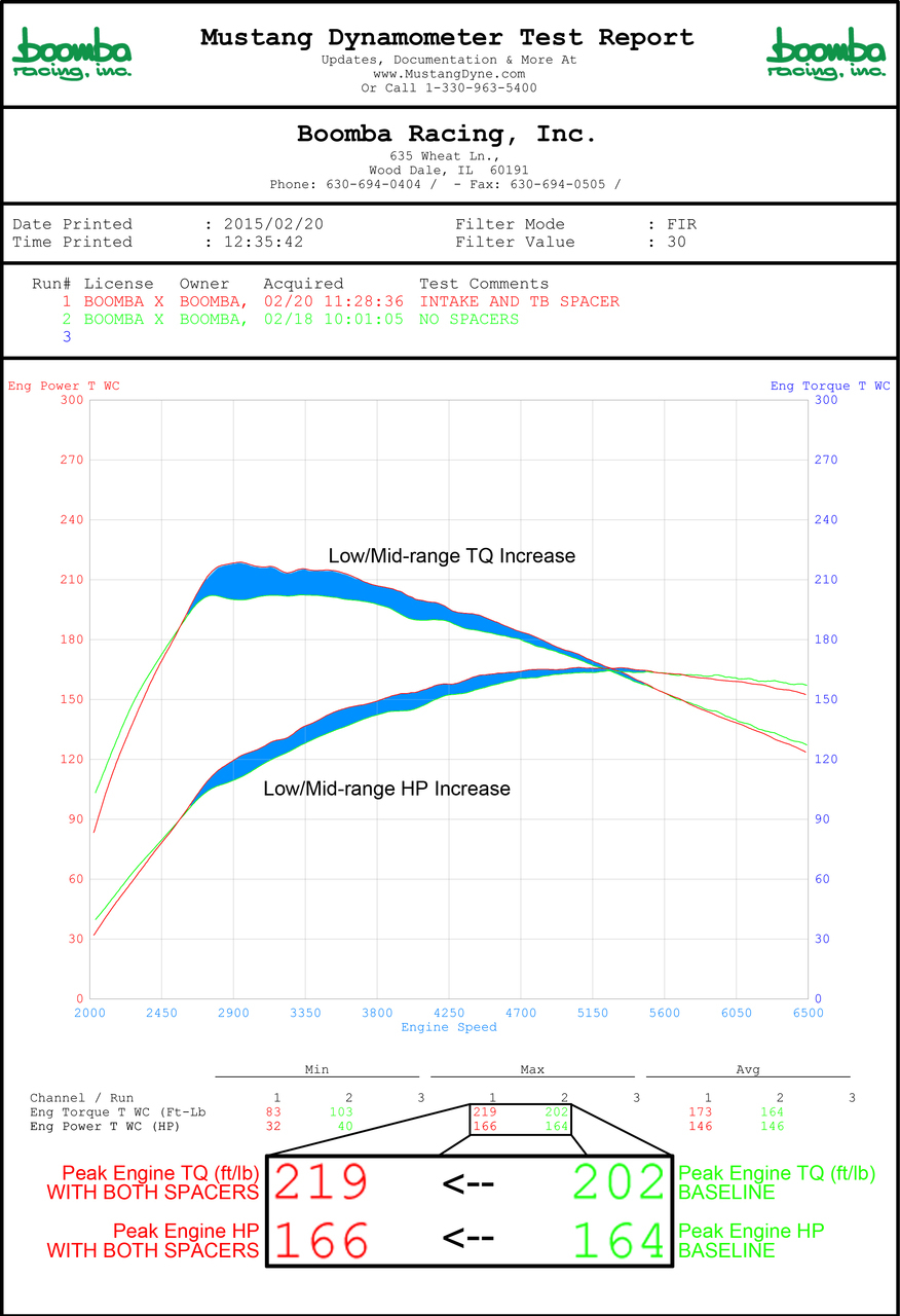This spacer adds volume to your intake plenum. This has been shown to aide in cylinder filling at lower RPM, smooth out throttle response, build boost sooner, and lengthen the effective wave pulse of the intake charge. In the picture shown above, you can see the dyno charts of this spacer paired with our intake manifold spacer and the gains are tremendous. Over 17 ft lbs of torque on our Fiesta ST (in using both spacers) and a significant change in the horsepower curve.