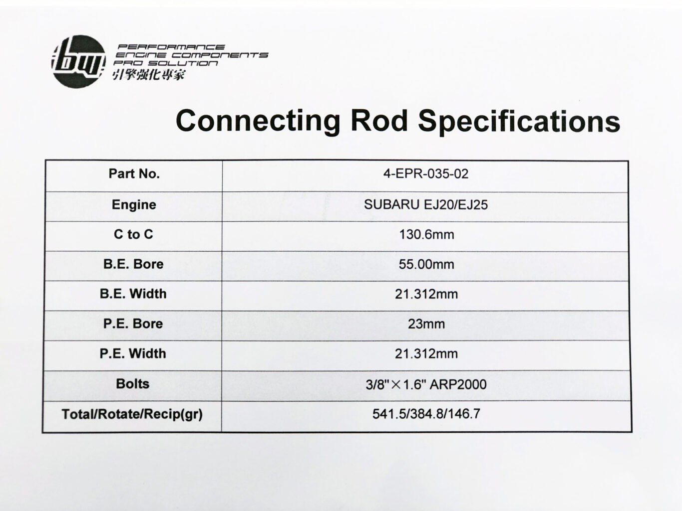 Bridgeway Forged Billet 4340 rod, H-Beam, Subaru EJ20/EJ25, 5.141"/130.6mm length, groove bushed pin with 3/8"x1.600" ARP2000 bolts, set of 4.